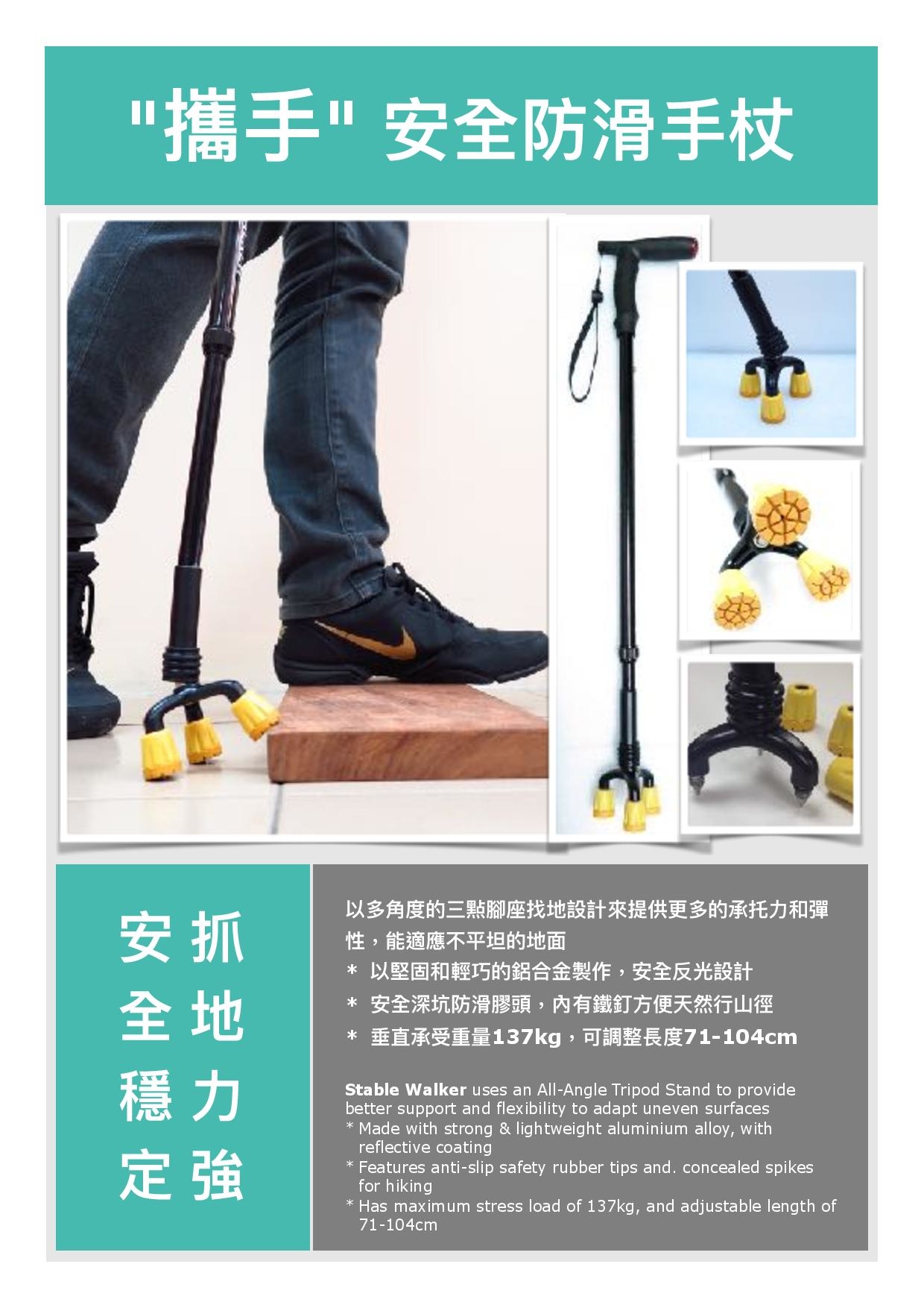 安全穩定抓地力強,以多角度的三㸃腳座設計來提供更多的承托力和彈性,能適應不平坦的地面。